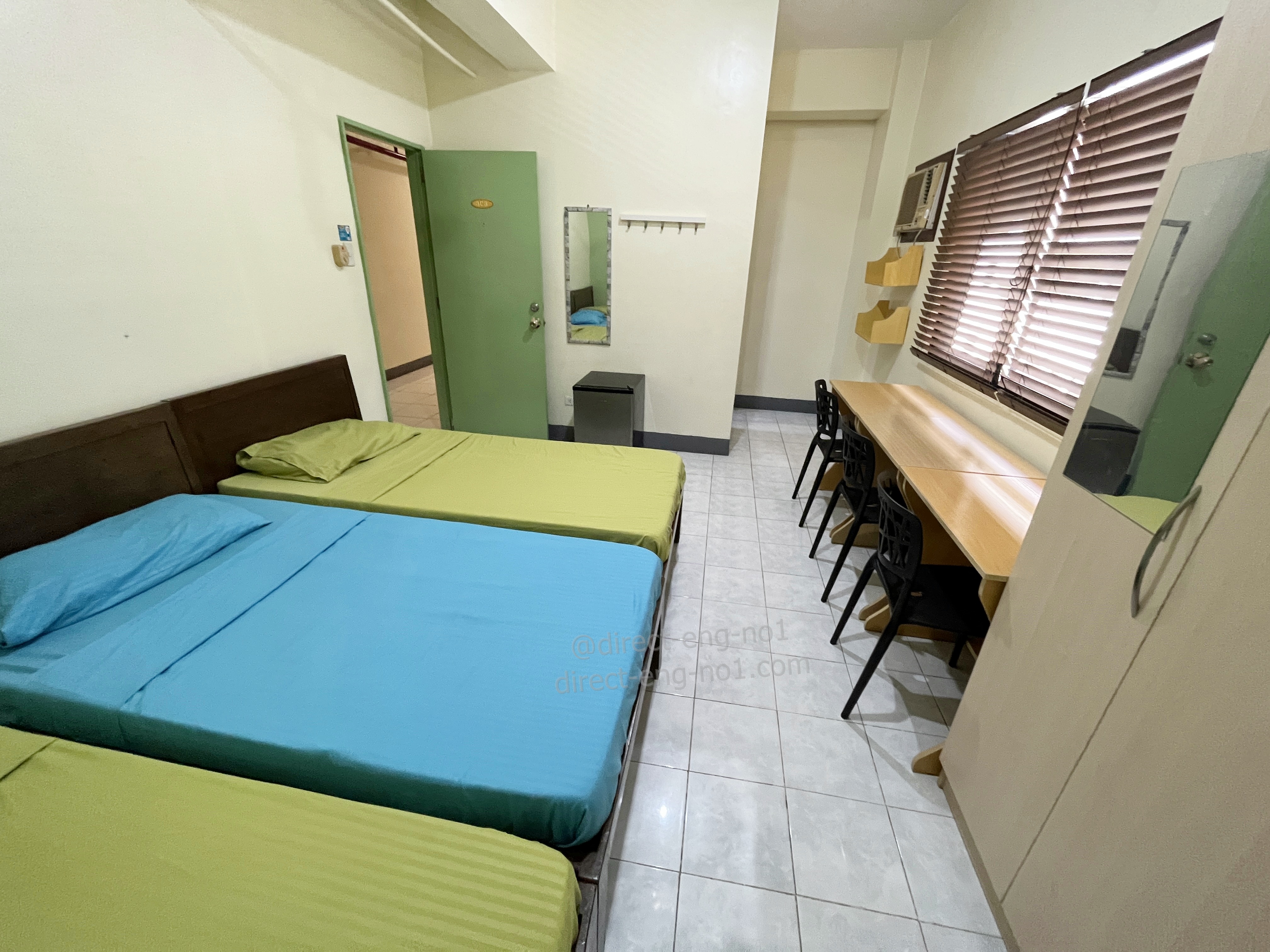 침대도 나란히 3개가 있습니다. IMS 기숙사의 특징은 에어컨이 기본이고, 선풍기도 천장에 달려있습니다. 그래서 시원한 바람이 골고루 퍼집니다.