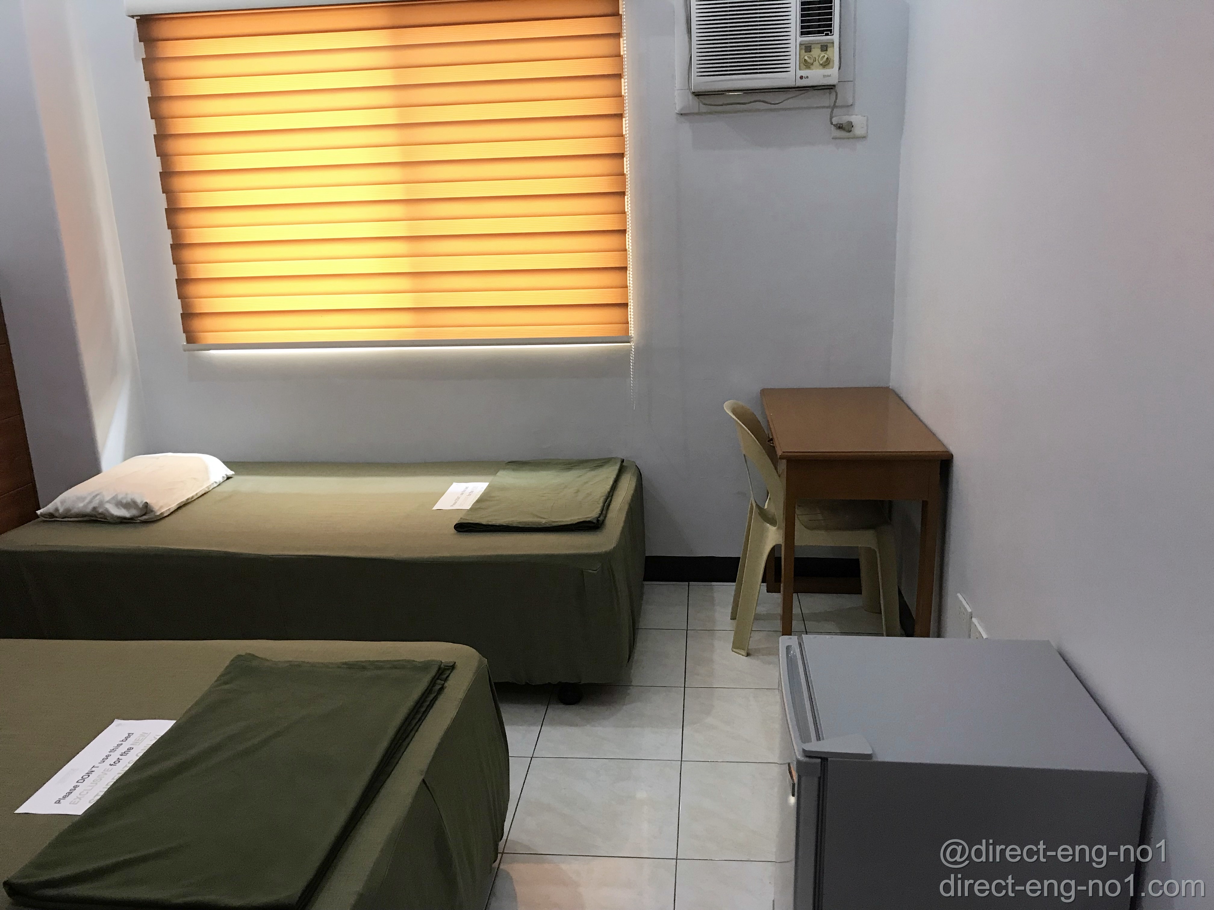 침대가 나란히 놓여있고 침대 앞에는 책상이 있습니다.