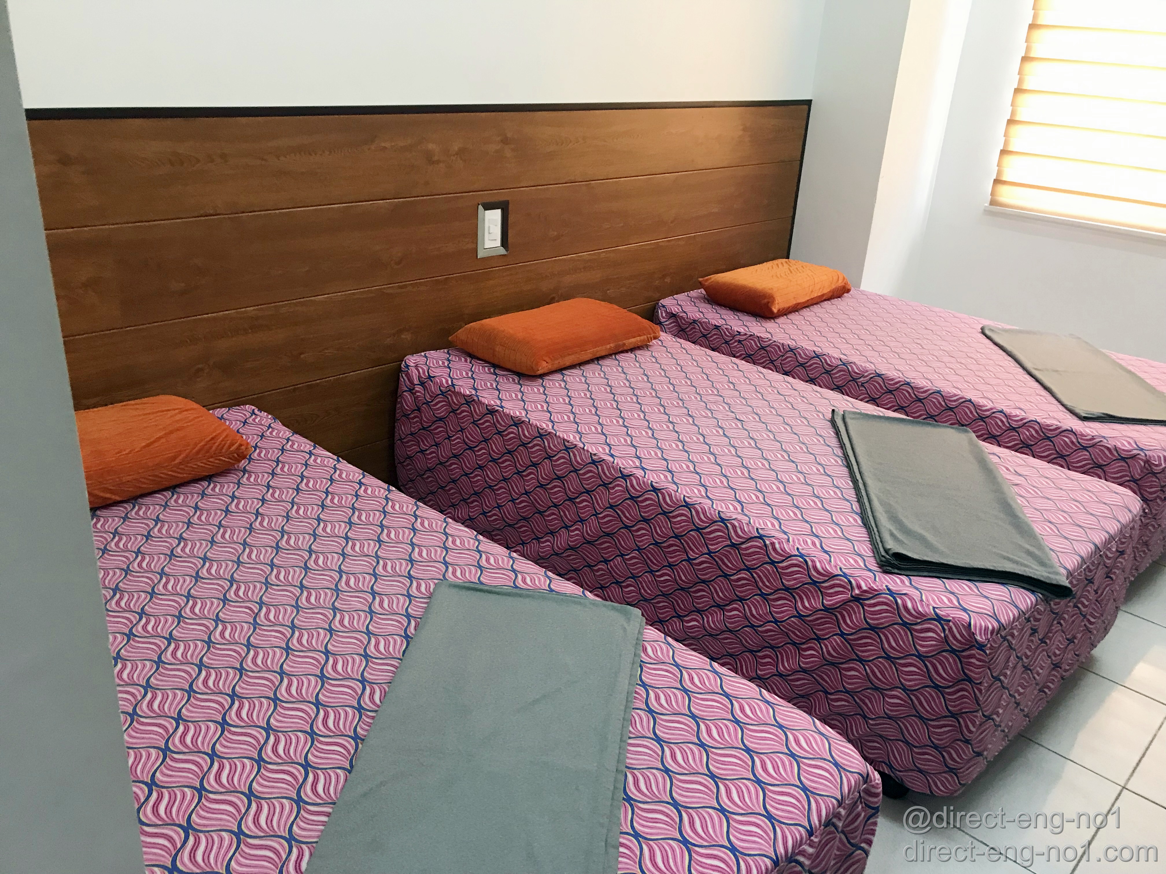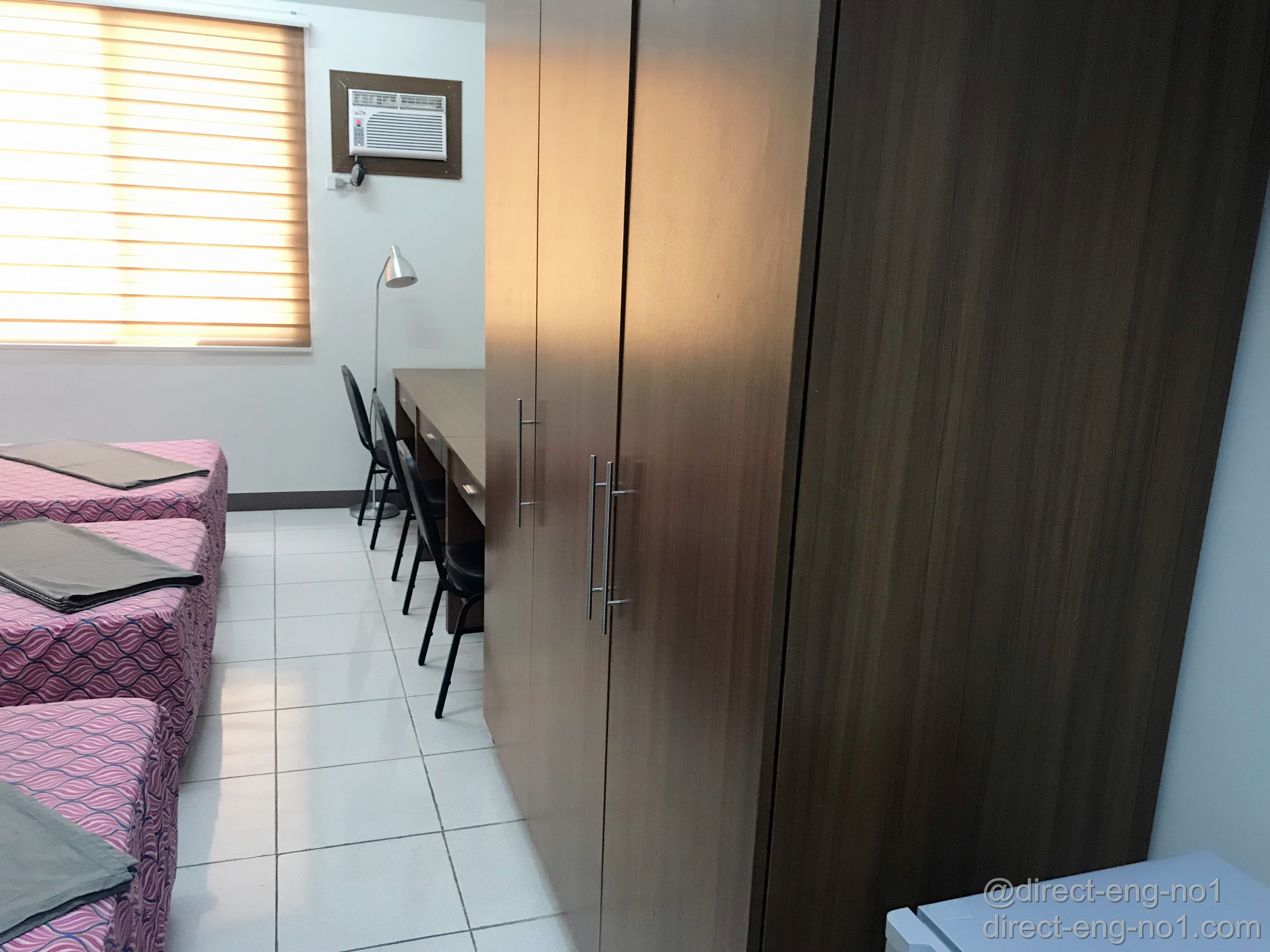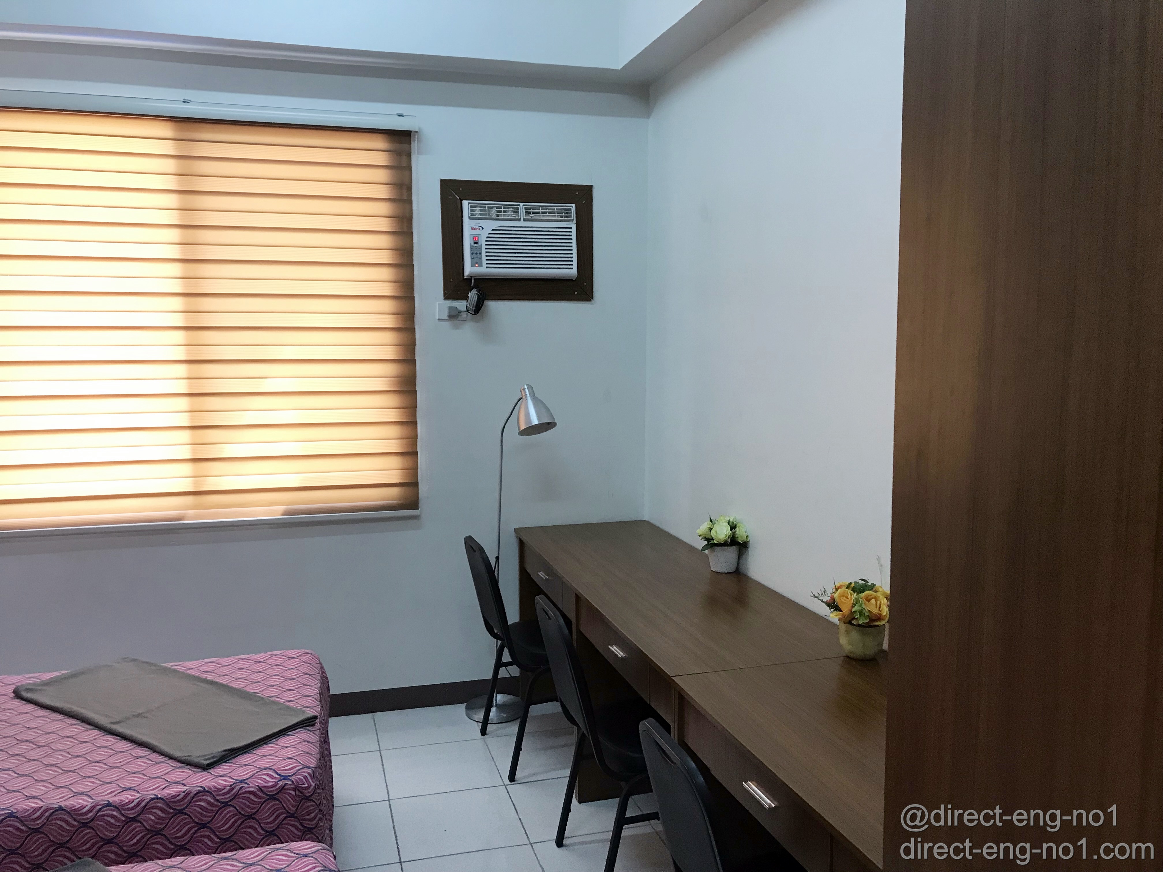 침대 앞에는 책상이 나란히 있고 벽에는 당연히(?) 에어컨도 있습니다.
