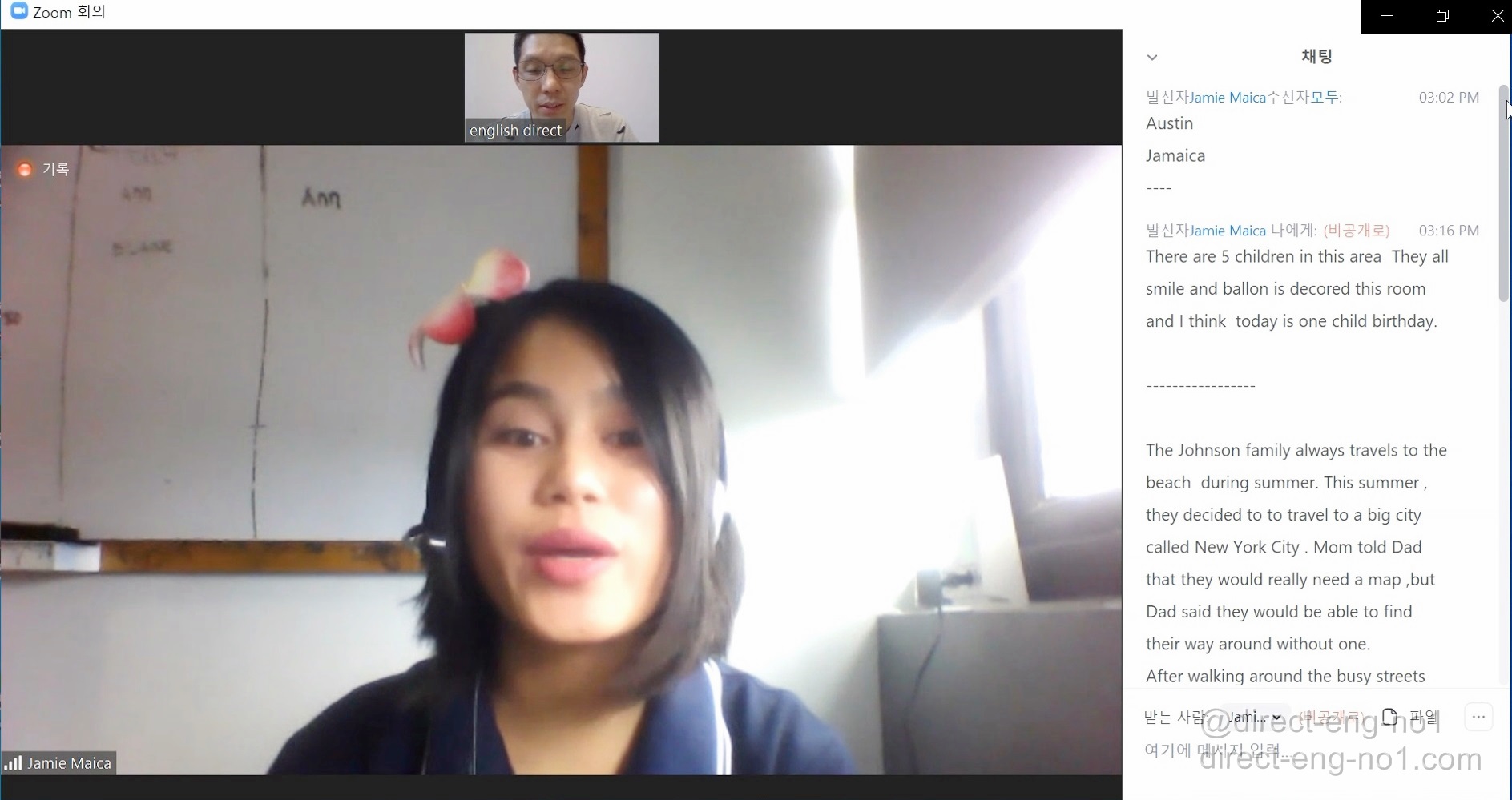 이 날 밤에 선생님이 줌(zoom) 채팅으로 테스트 결과를 보내왔습니다.