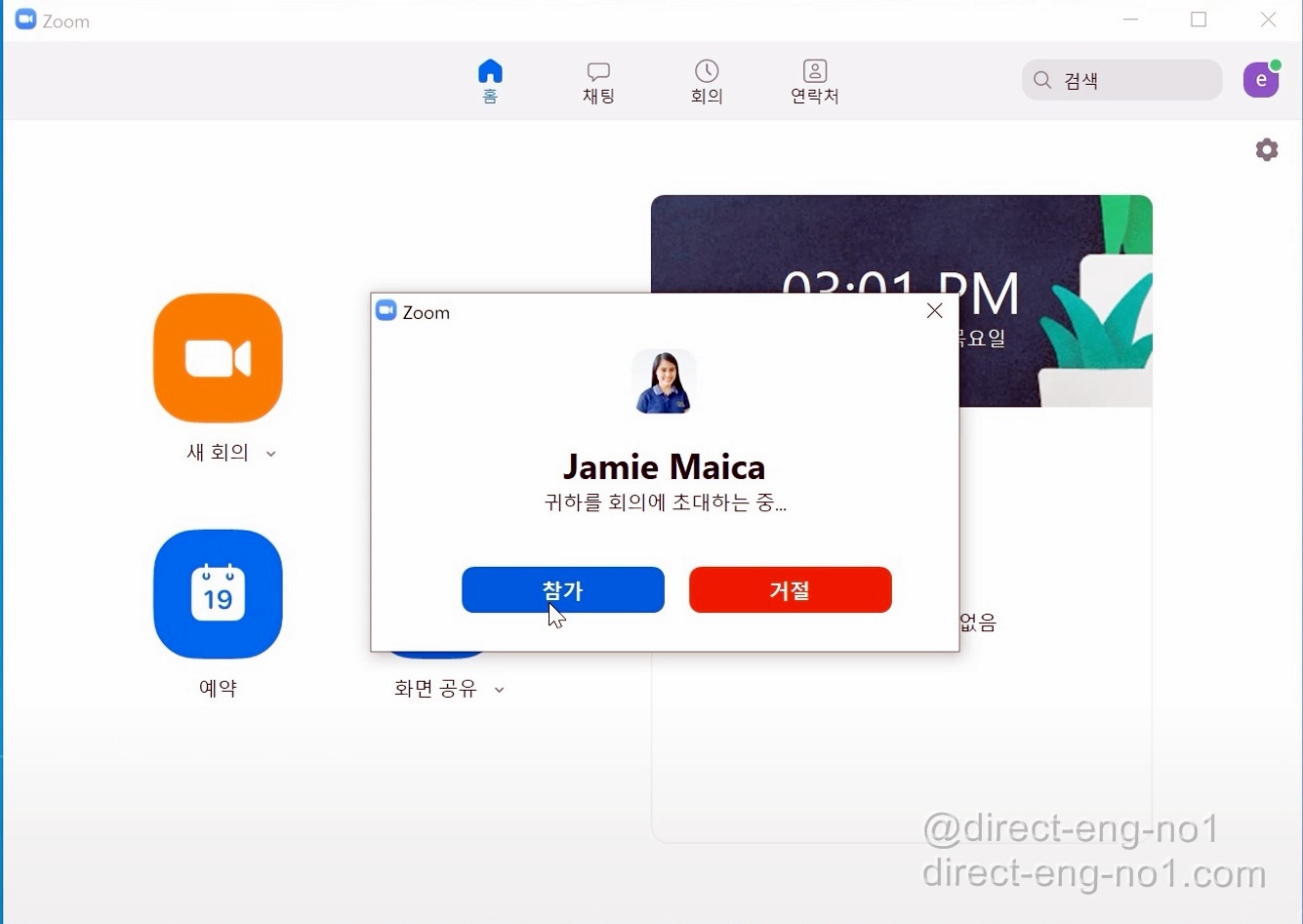 수업 시간이 되면 알람 소리가 울리면서 선생님의 초대가 옵니다.