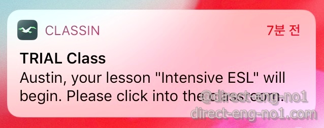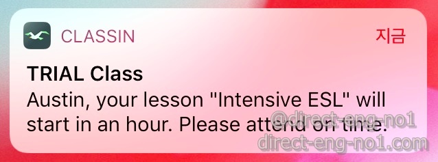 수업 한 시간 전에 당연히 알림이 옵니다. 그런데 뭔가 이상합니다. 그냥 ESL이 아닌 인!텐!시!브 과정입니다.