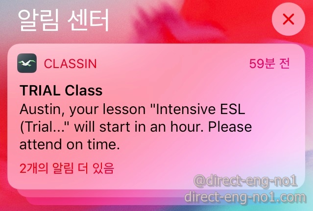 다른 생각 못하도록 수업 알림이 옵니다. 50분 수업을 한 번 해보니 적응이 됩니다.