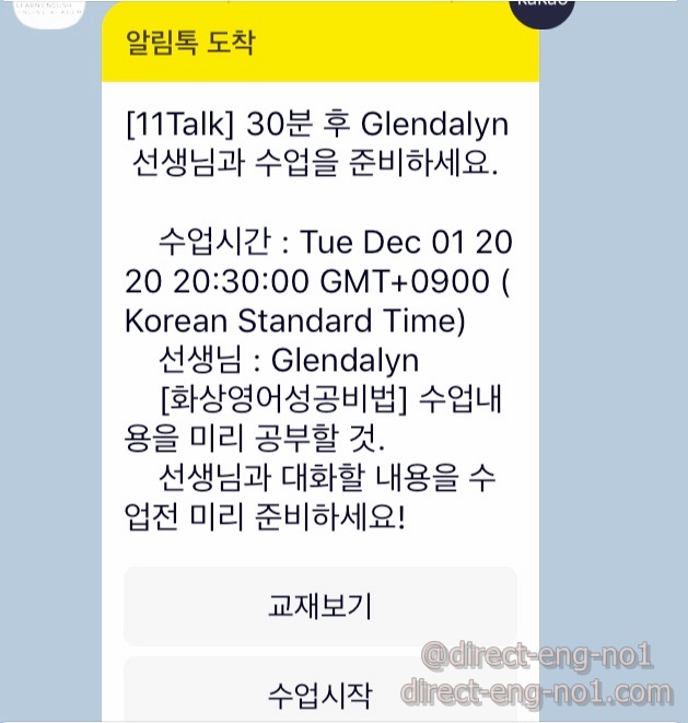 11talk는 수업 30분 전에 카카오톡으로 알림톡을 보내줍니다.