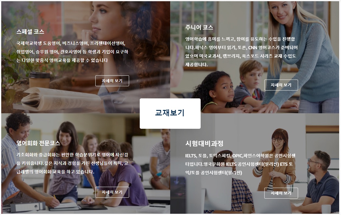 성인영어회화, 주니어 과정, IELTS 등의 자격시험대비, 비즈니스 등의 스페셜 과정이 있습니다.
