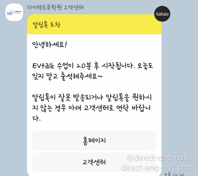또한, 수업 20분 전에는 유학원에서 알림톡을 보내줍니다.
