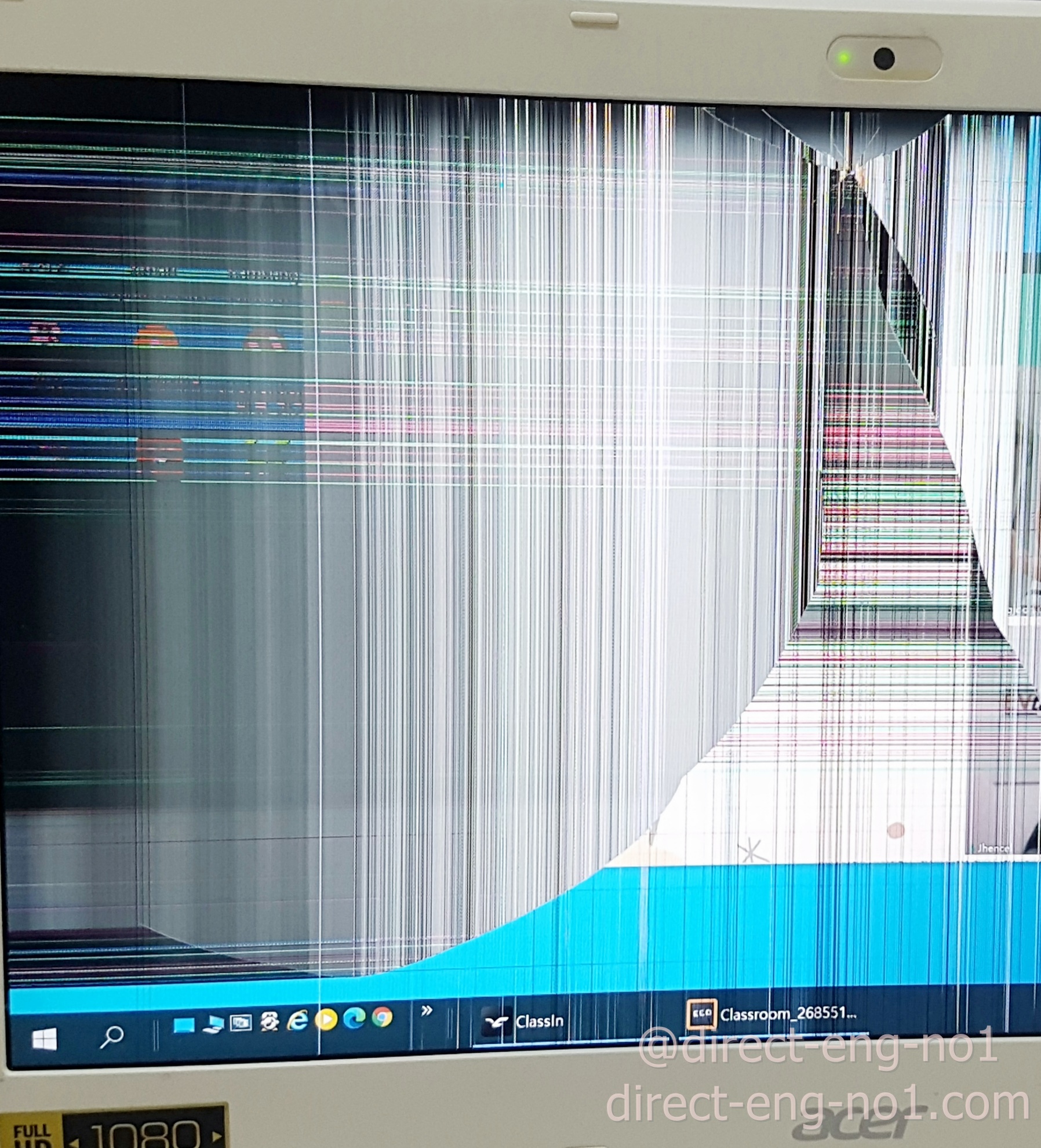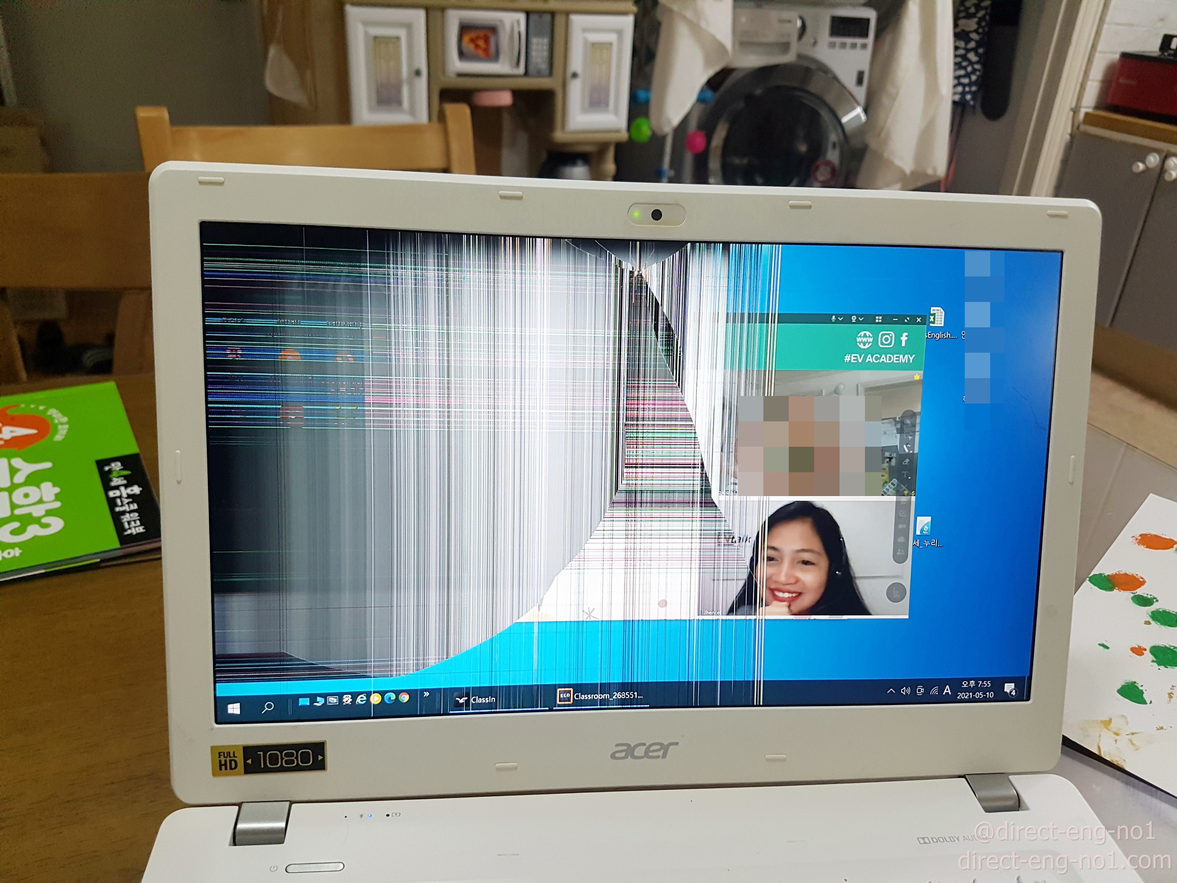 노트북 화면이 처참하게 망가졌습니다. 어린 학생이 화상영어 수업을 듣다가 텐션이 올라서 그만 화면을 내리쳤다고 합니다.